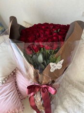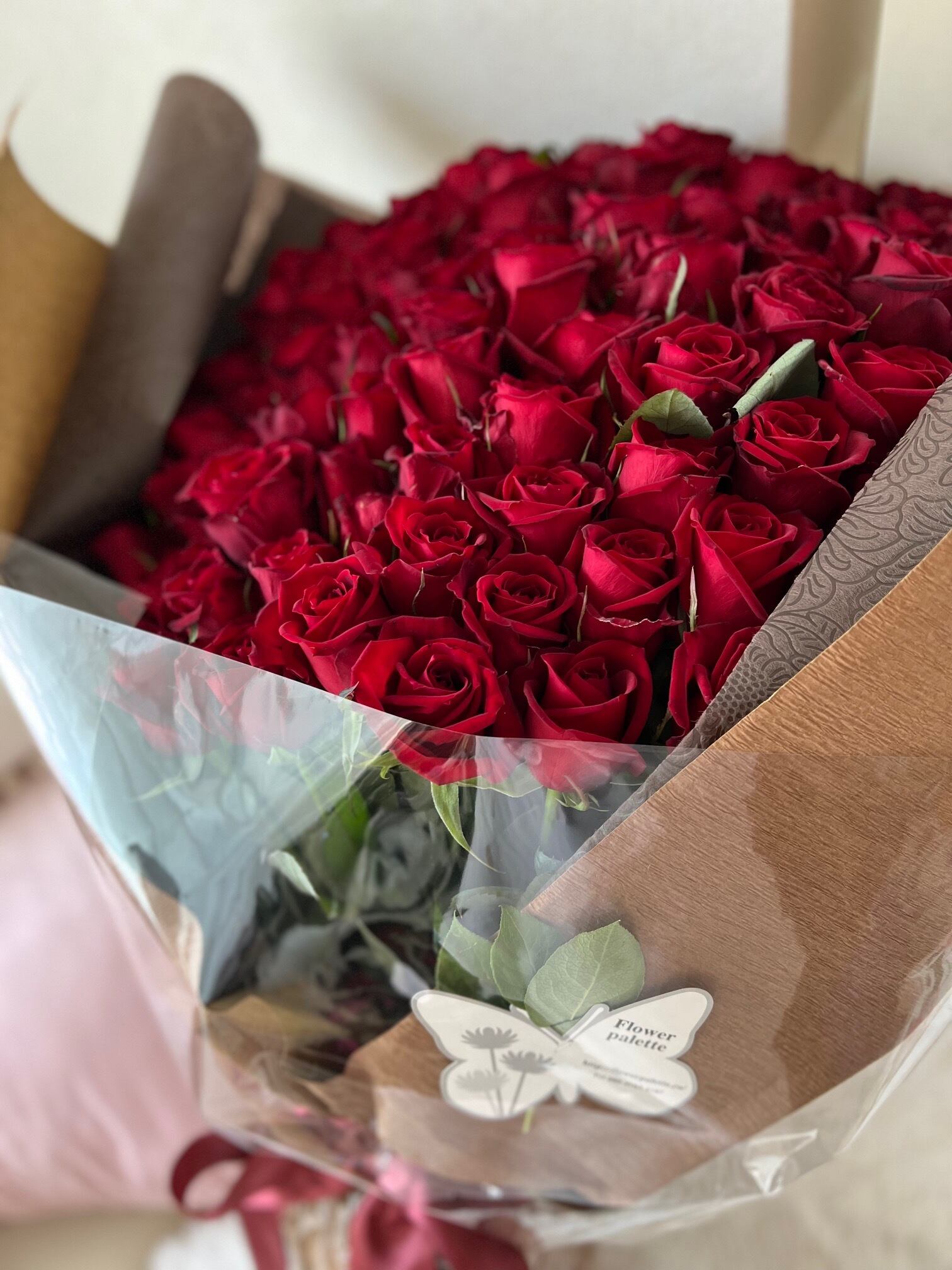 厳選された新鮮な赤バラを100本使用し、ボリューム感と美しさを追求しました。