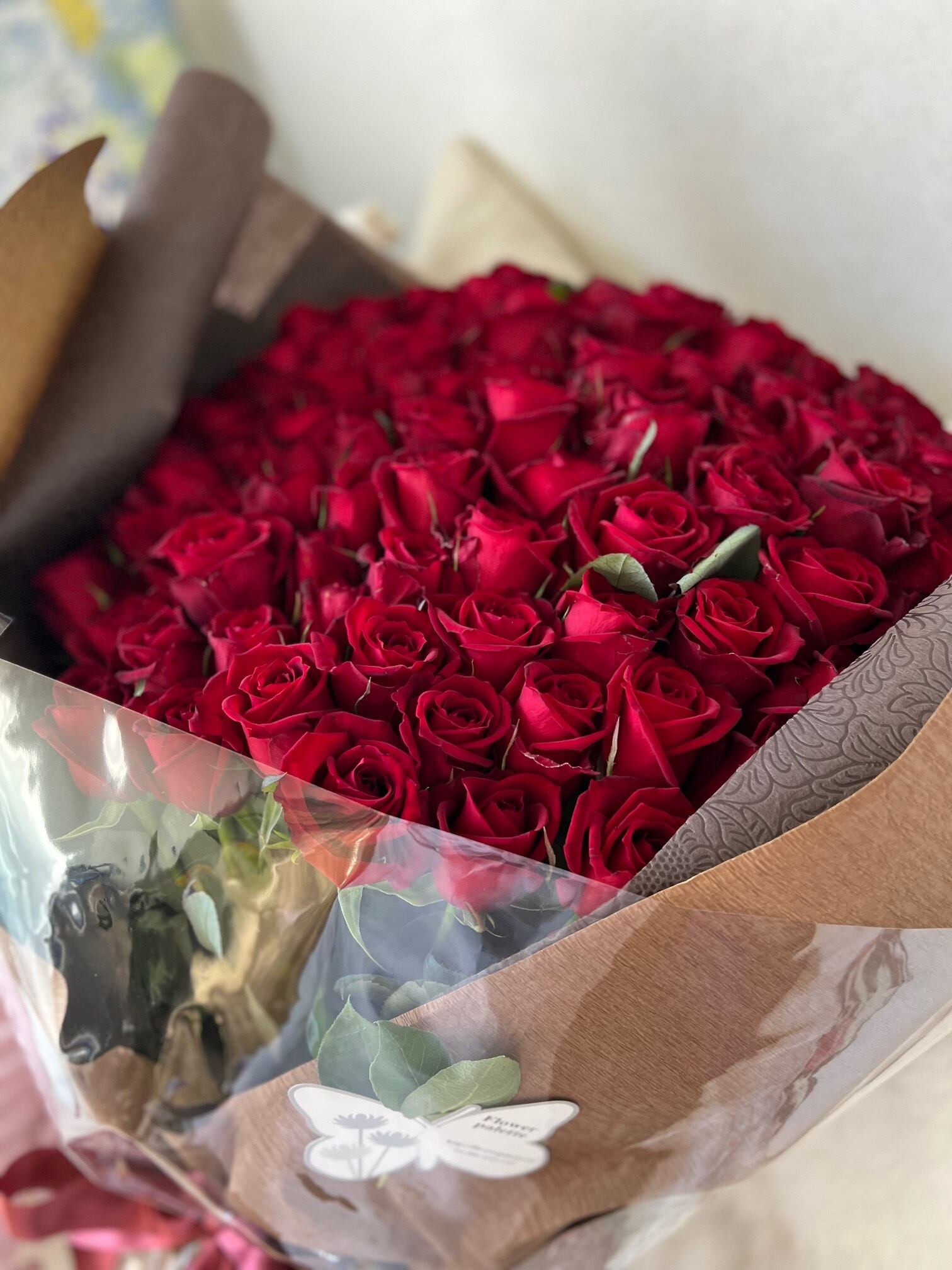 情熱の象徴、100本の赤バラの花束です。