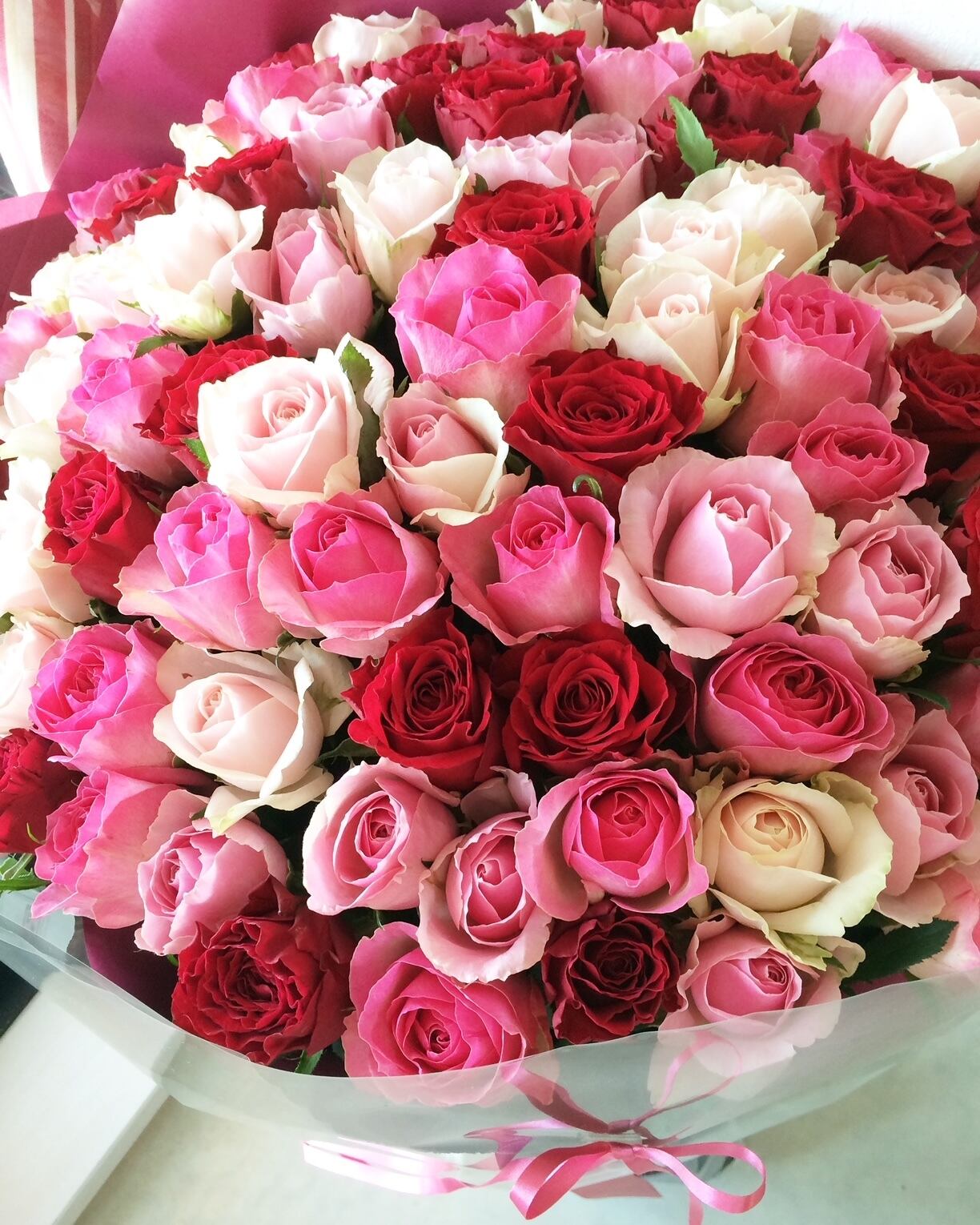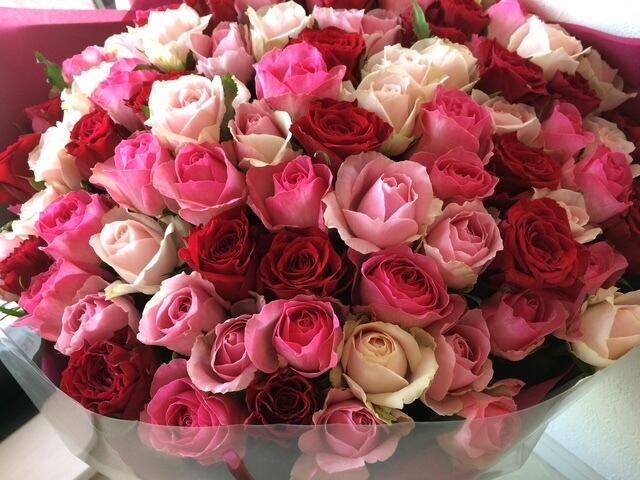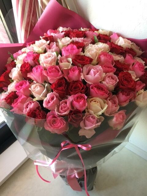 華やかでかわいらしい100本のピンク系のバラをミックスした花束です。